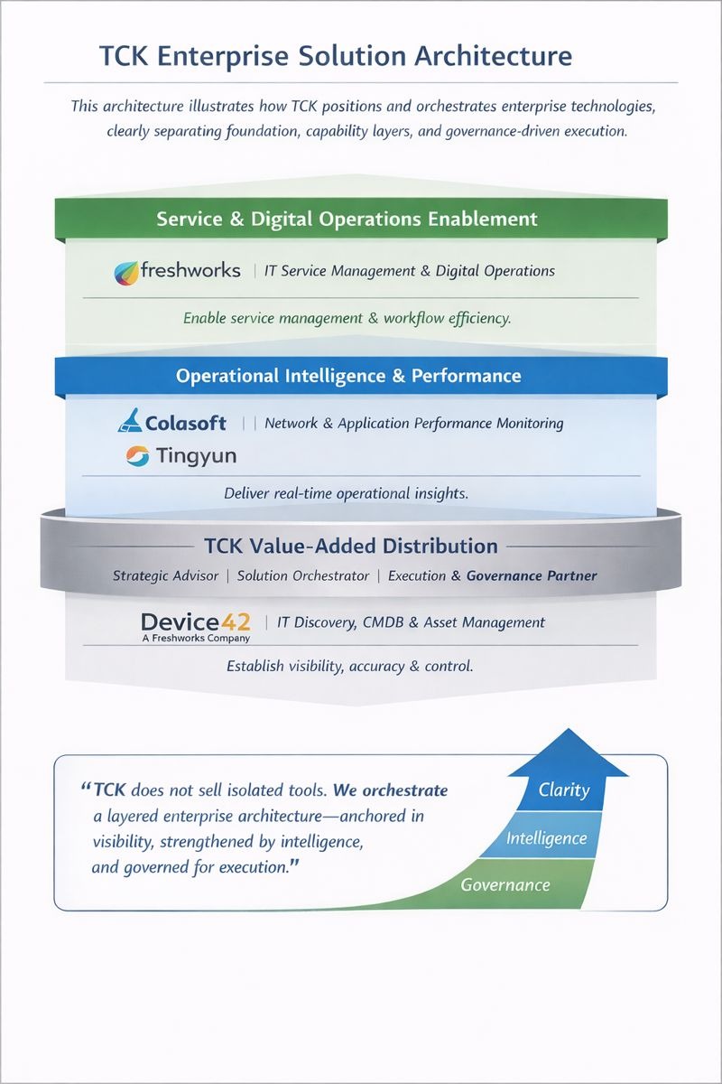 “TCK does not sell isolated tools. We orchestrate a layered enterprise architecture—anchored in visibility, strengthened by intelligence, and governed for execution.”